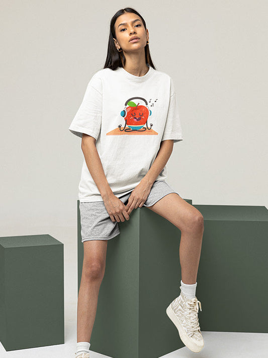 Apple Meditation- White Round Neck Yoga Oversized T-shirt